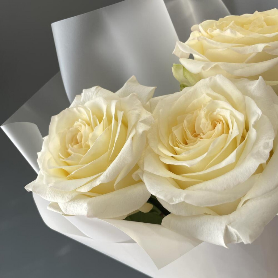 На фото букет из 3 кремовых роз. В составе: роза 3 шт, дизайнерская упаковка 1 шт, атласная лента 1 шт, . Все цветы свежие и ароматные, букет красиво оформлен и отлично подходит для подарка. Доступна доставка цветов или самовывоз.