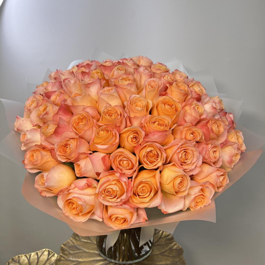 На фото букет из 75 коралловых роз. В составе: роза 75 шт, дизайнерская упаковка 1 шт, атласная лента 1 шт, . Все цветы свежие и ароматные, букет красиво оформлен и отлично подходит для подарка. Доступна доставка цветов или самовывоз.
