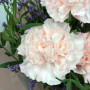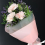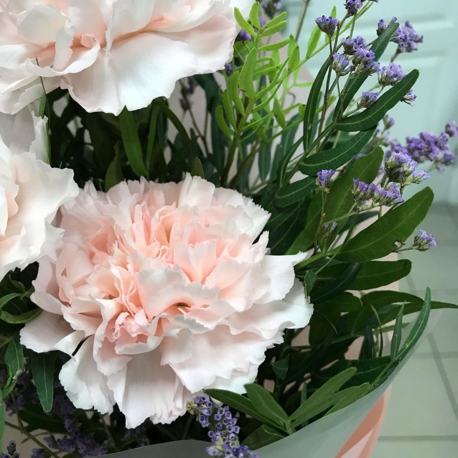 На фото букет из 3 гвоздик и статицы. В составе: гвоздика 3 шт, статица 1 шт, папоротник 1 шт, крафт-бумага 1 шт, атласная лента 1 шт, . Все цветы свежие и ароматные, букет красиво оформлен и отлично подходит для подарка. Доступна доставка цветов или самовывоз.