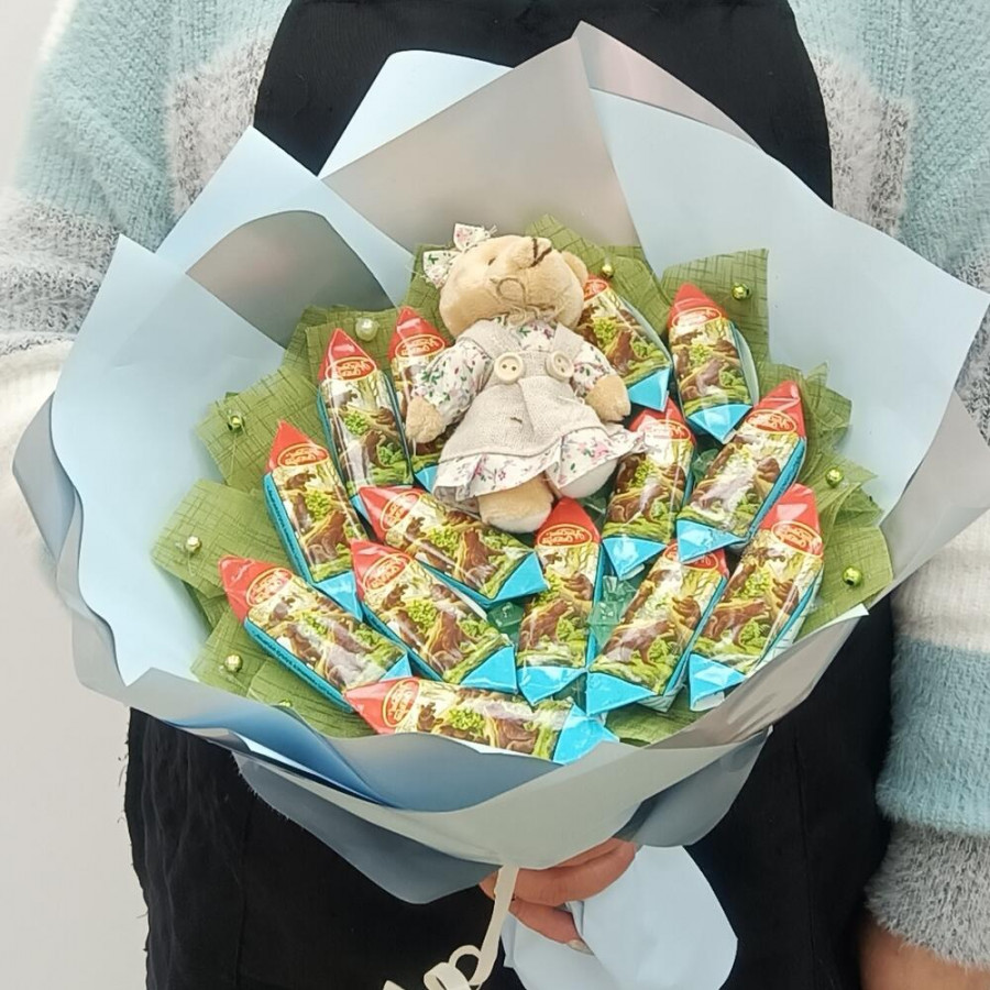 Лента атласная - 1 шт. Упаковка дизайнерская - 2 шт. Мишка плюшевый - 1 шт. бусинки - 25 шт. конфеты мишка косолапый - 14 шт.